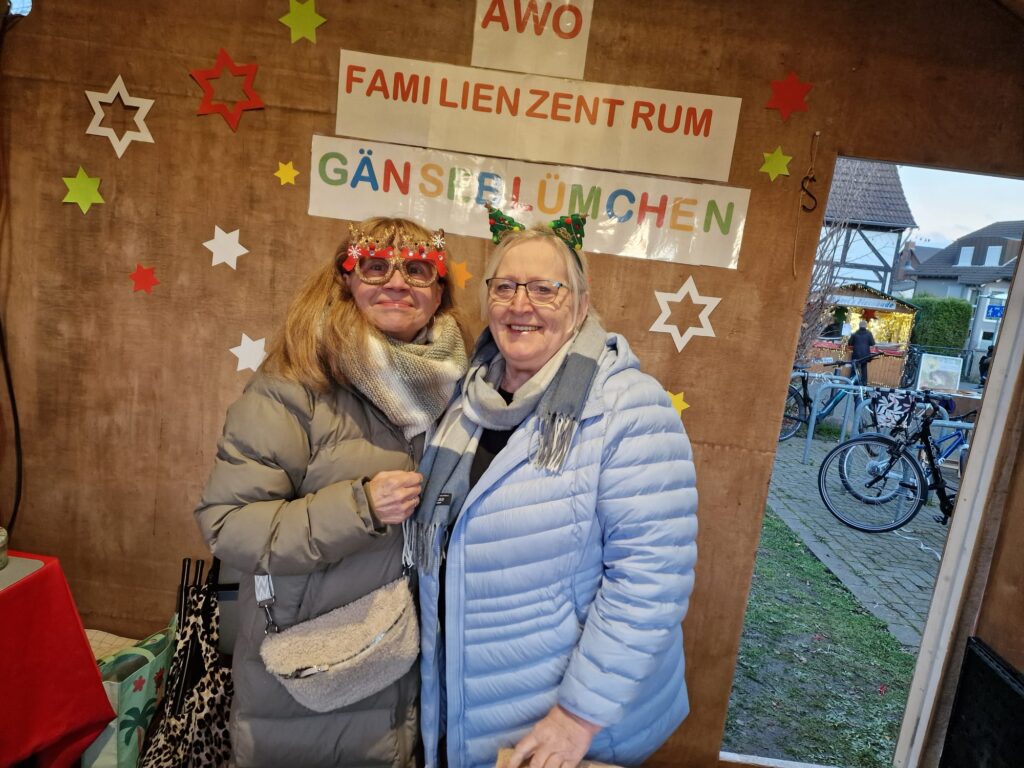 Vertreterinnen der AWO-Methler unterstützten in diesem Jahr die Kita Gänseblümchen bei der Standbetreuung. Am Samstag half Bärbel Filthaut mit aus und steuerte auch selbst gefertigte Wichtelmännchen und Sterne in Hardangerstickkunst bei. Am Sonntag betreuten dann Gaby Keutgen-Bartosch (Vorsitzende der AWO Methler) und Manuela Erdelkamp den Stand. In der letzten Stunde des Marktes am Sonntag kam dann auch Alexandra Möller dazu, die noch einmal den Verkauf der gespendeten Sachen richtig „anheizte“! Gaby Keutgen-Bartosch, Manuela Erdelkamp, Petra Borosch und Marlene Skodd hatten im Vorfeld des Marktes leckere Plätzchen gebacken. Diese und die Plätzchen der Kita-Eltern gingen weg „wie warme Semmeln“. So konnte der Stand einen ordentlichen Erlös verzeichnen.