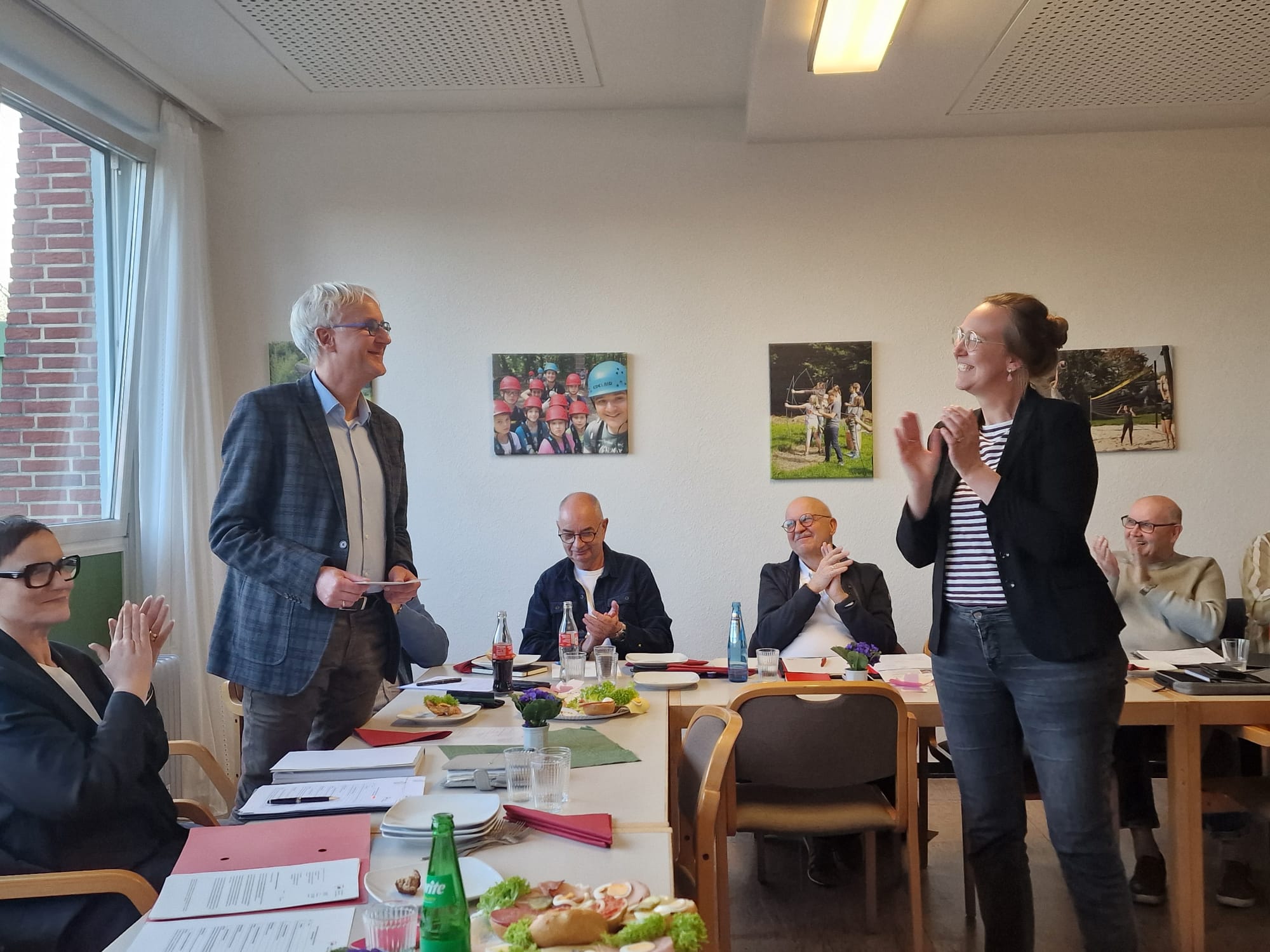 Ein wesentlicher Punkt der Sitzung war die Verabschiedung des scheidenden Geschäftsführers Rainer Göpfert. Silvia Gosewinkel würdigte seine Verdienste in einer kurzen Laudatio und überreichte ein kleines Präsent. Im Anschluss erfolgte die Vorstellung der neuen Geschäftsführerin, Christine Scholl. Sie übernimmt in einer Doppelspitze mit Jens Degelmann die Geschäftsführung der AWO UB Ruhr-Lippe-Ems.